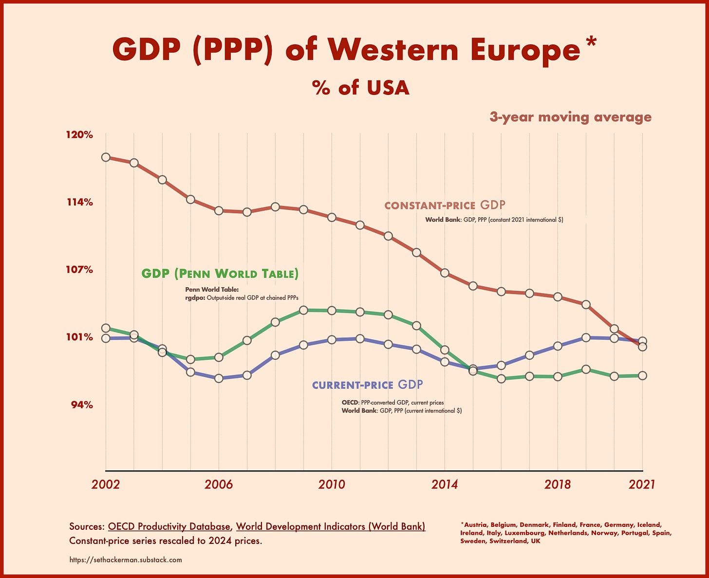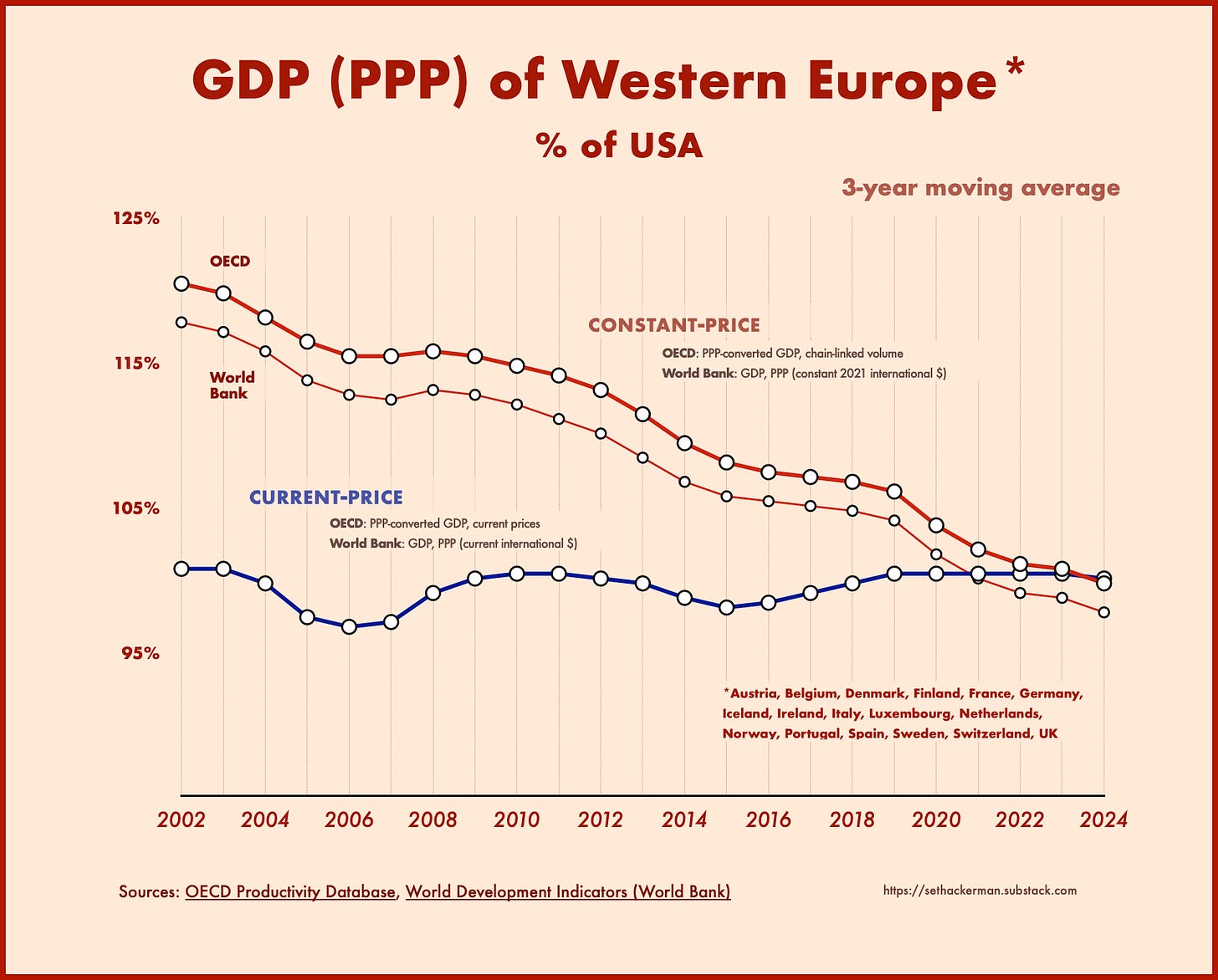 Although the two metrics give similar numbers for the most recent year (2024), the constant-price series diverges further and further from the current-price series the deeper you go back in time, with Europe appearing to get richer and richer relative to America, and thus poorer and poorer as you approach the present.
