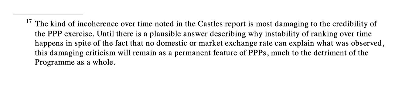 I’m not, of course, the first person to notice this problem. It’s been discussed in the technical literature for years. As far back as 1998, the Ryten Report, a high-level independent review of the PPP program solicited by the IMF and World Bank, warned that the problem of “incoherence over time” was “most damaging to the credibility of the PPP exercise” and that this “damaging criticism” would haunt the program “until there is a plausible answer.”
