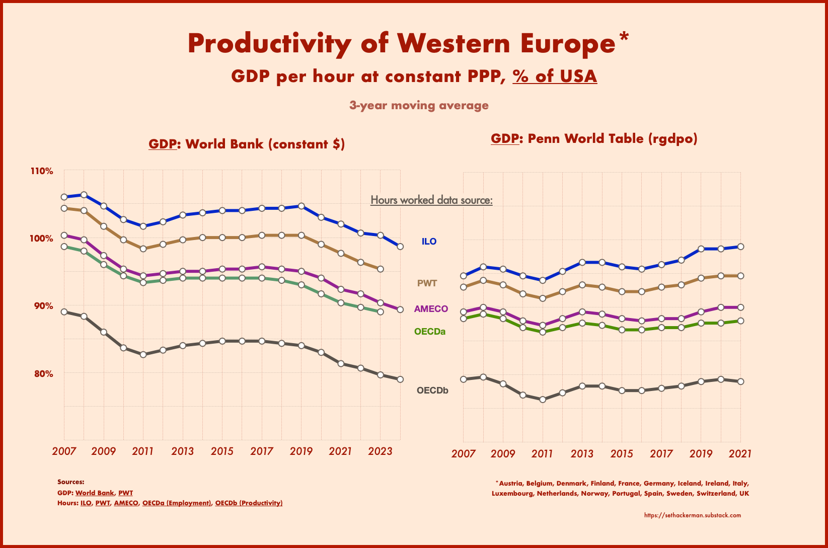 Although different international databases (OECD, PWT, ILO, AMECO) give similar numbers for total hours worked in Europe, they differ wildly for US hours. Of these, the ILO numbers are closest to those found in the BLS’s now-defunct International Labor Comparisons (ILC) database, which was expressly harmonized for US comparability. (The ILC was eliminated in 2013 due to sequestration budget cuts; its data end in 2011.)